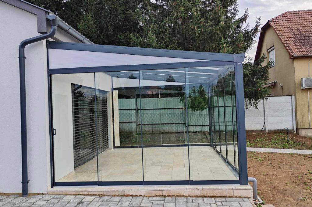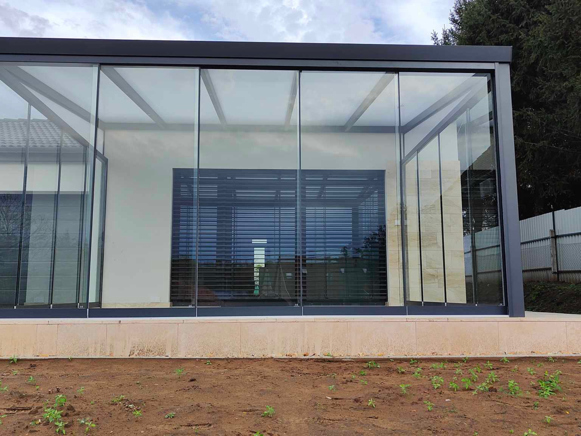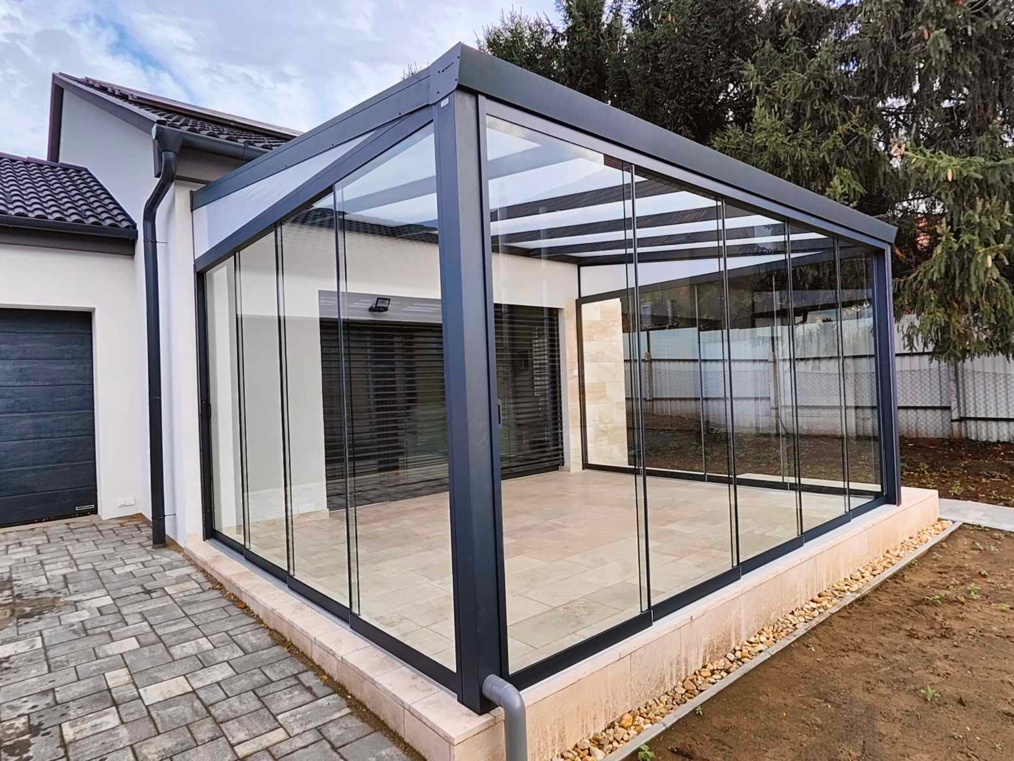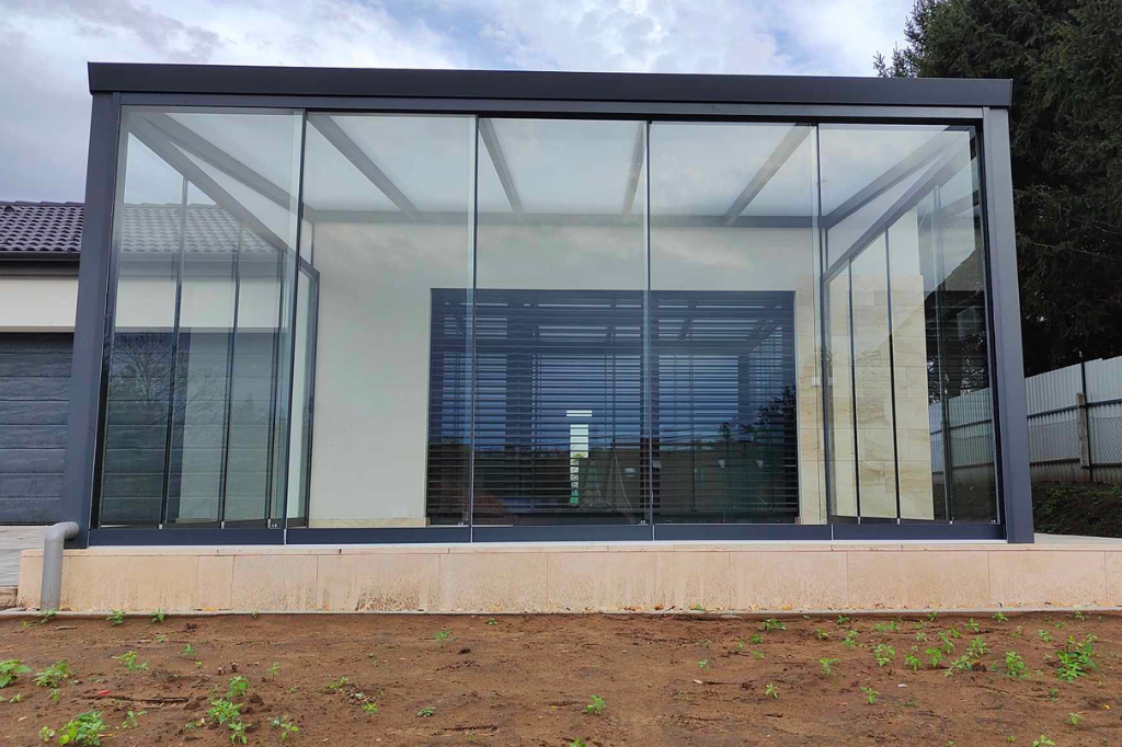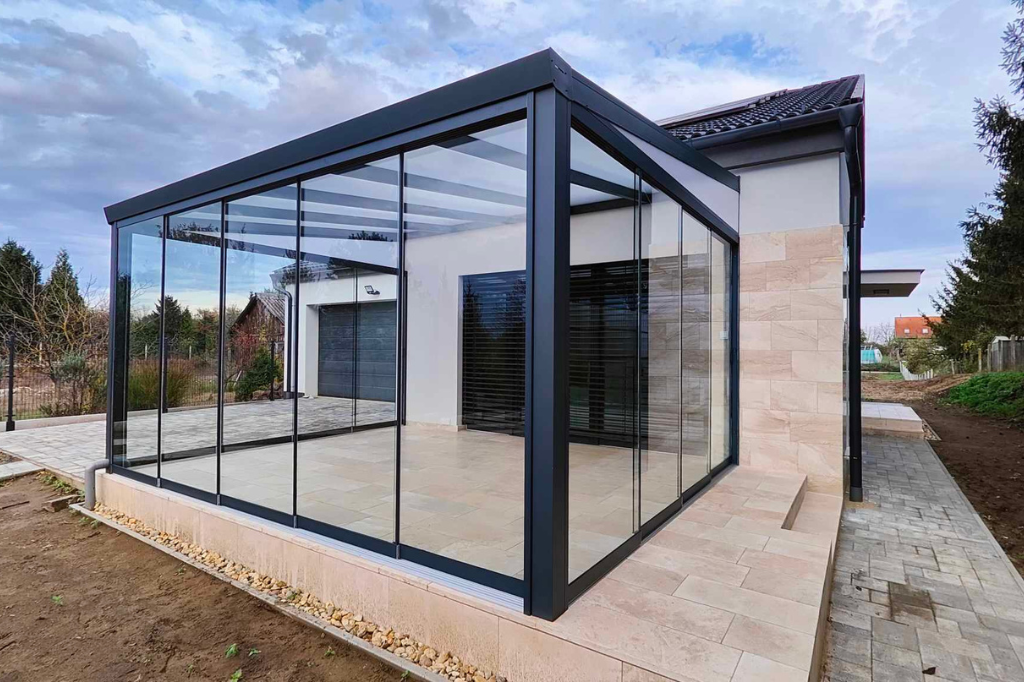 Prezentowany projekt opiera się na nowoczesnej, aluminiowej konstrukcji w kolorze antracytowym, która została zamontowana bezpośrednio do elewacji domu. Całość zabudowy została wykonana z przejrzystego szkła hartowanego, co daje efekt pełnej otwartości na otoczenie i zapewnia maksymalną ilość naturalnego światła.