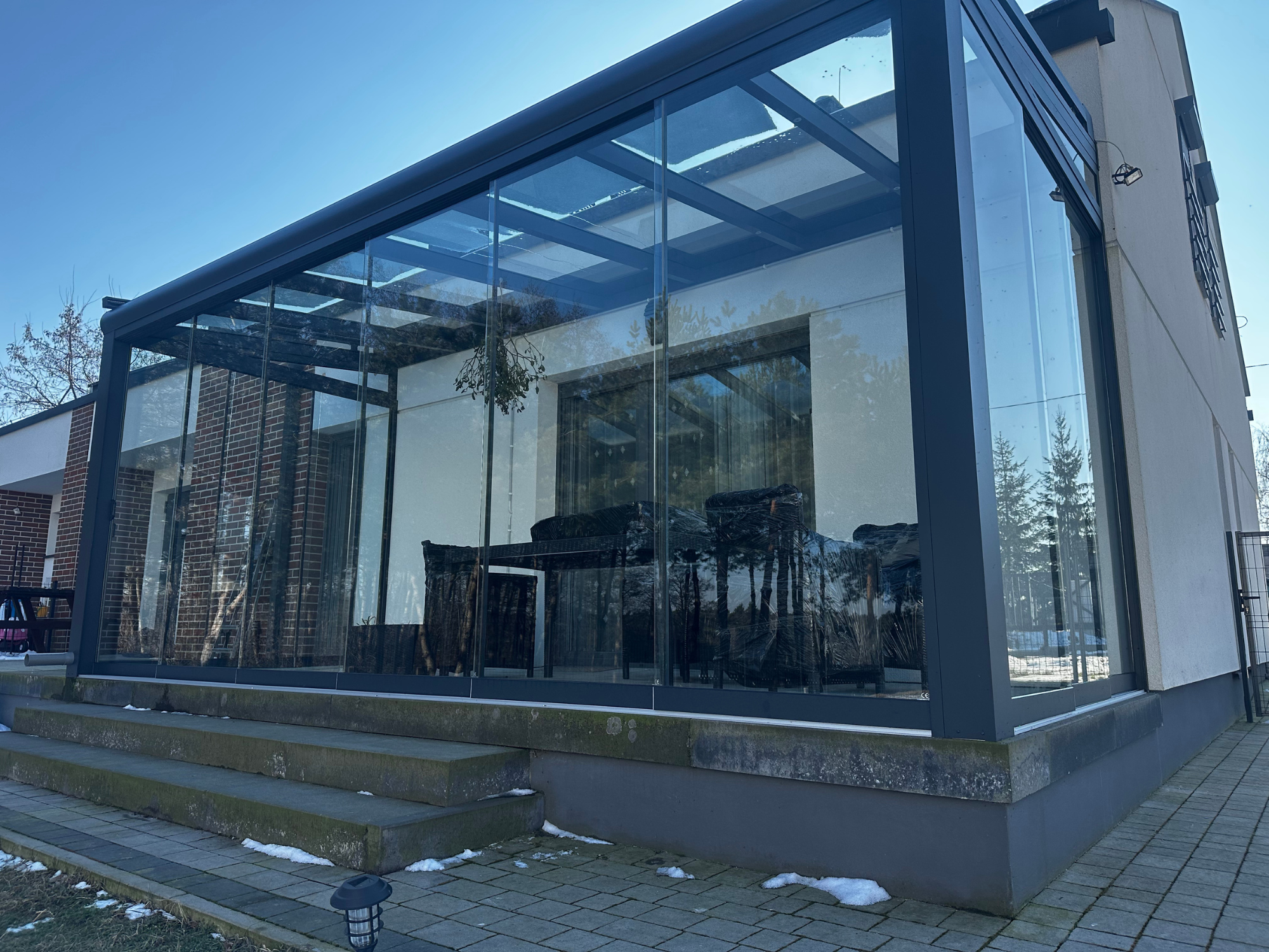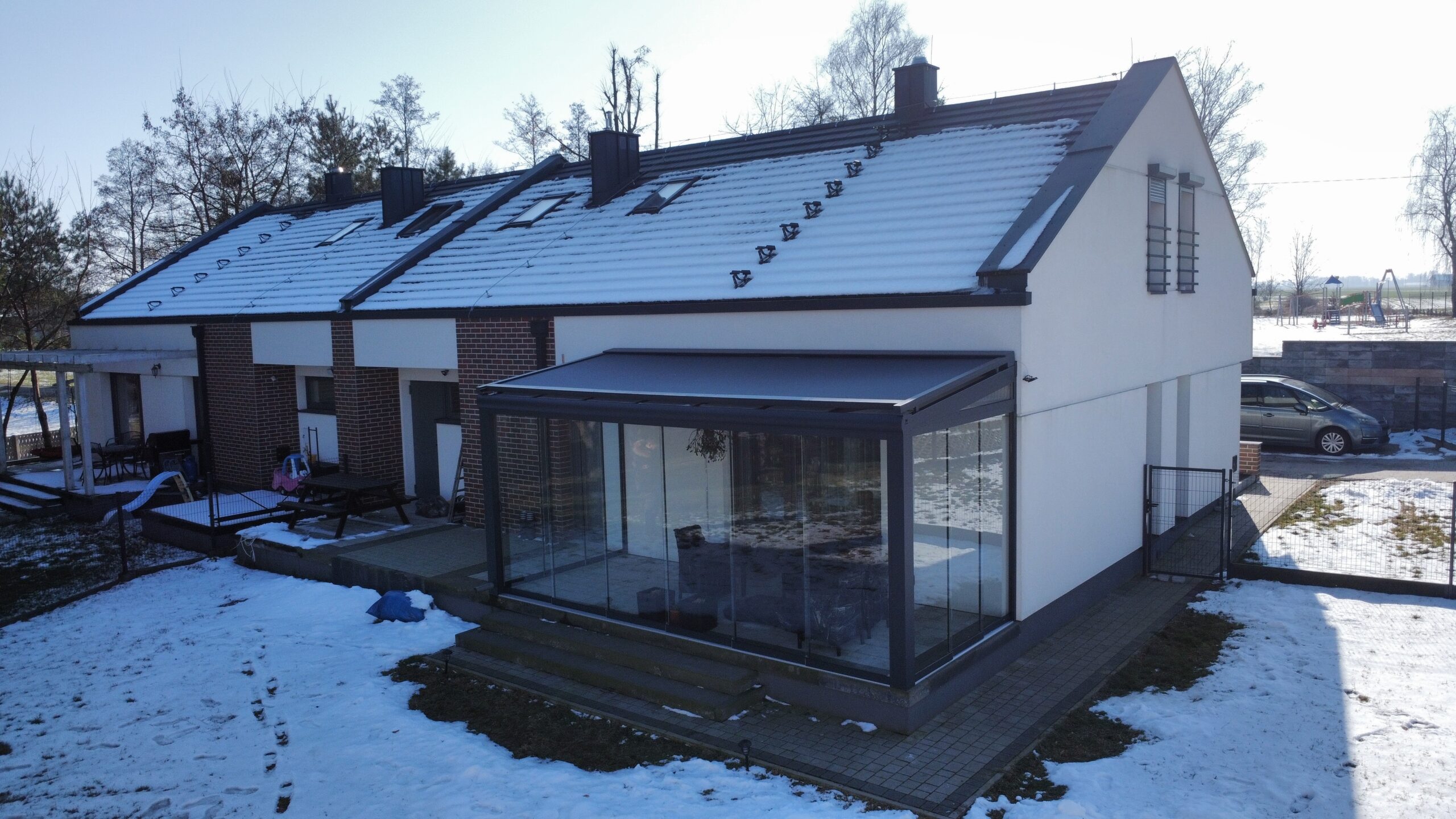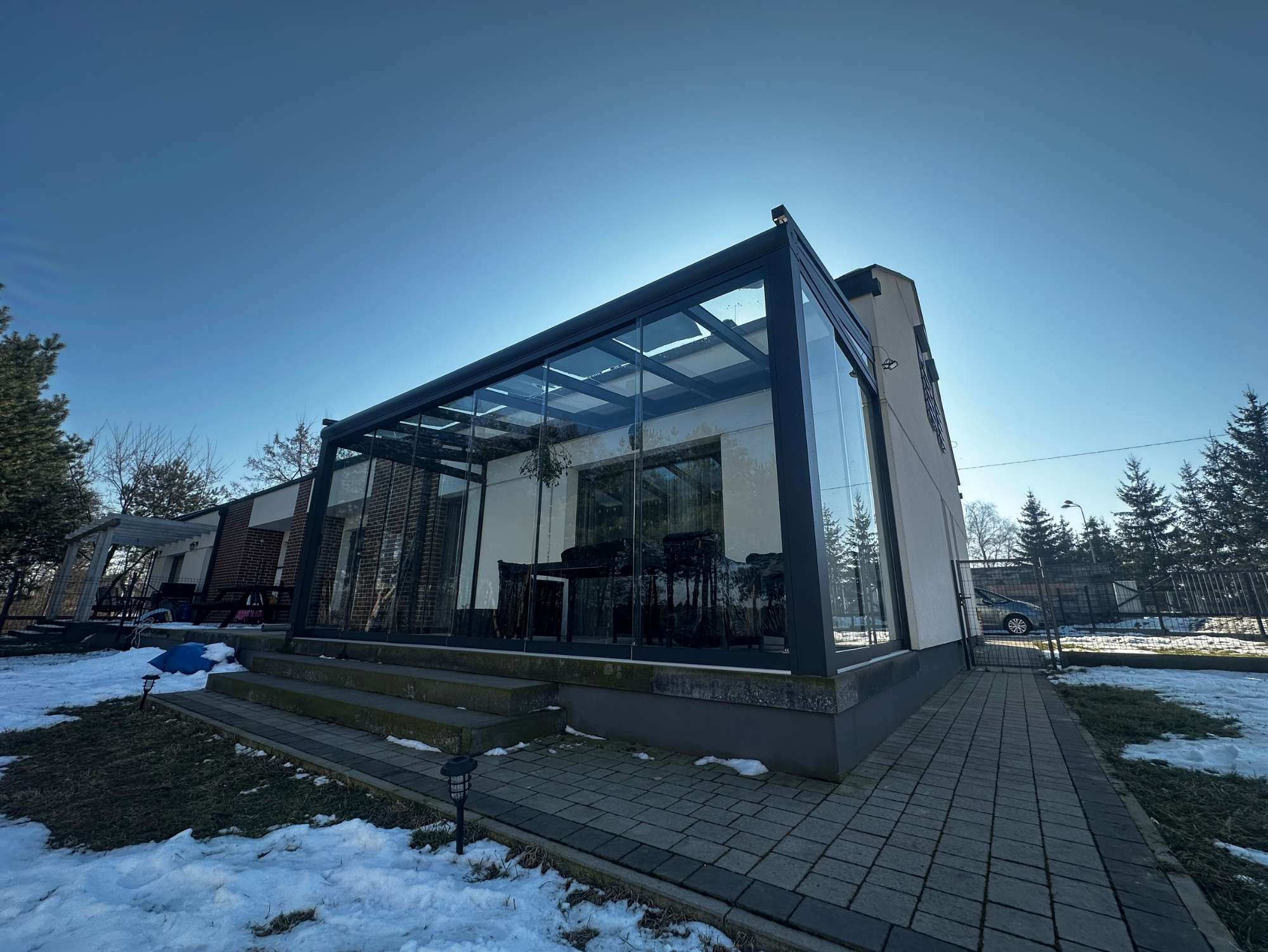 Zadaszenie tarasu zostało wykonane z profili aluminiowych w kolorze antracytowym. Dach z przejrzystego szkła hartowanego zamontowano na równoległych krokwiach, co pozwala zachować maksymalną ilość światła dziennego. Całość została zabudowana przesuwnymi szklanymi ścianami bezramowymi, które doskonale chronią wnętrze przed wiatrem i opadami, a jednocześnie nie ograniczają widoku na ogród. Nad pokryciem dachowym zastosowano roletę elektrycznie wysuwaną. Projekt został zrealizowany przy nowoczesnym domu z podwyższoną strefą tarasową, co nadaje całej realizacji wyjątkowego charakteru.
