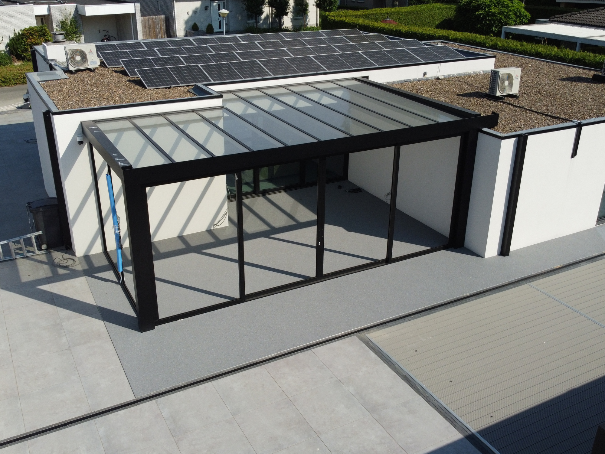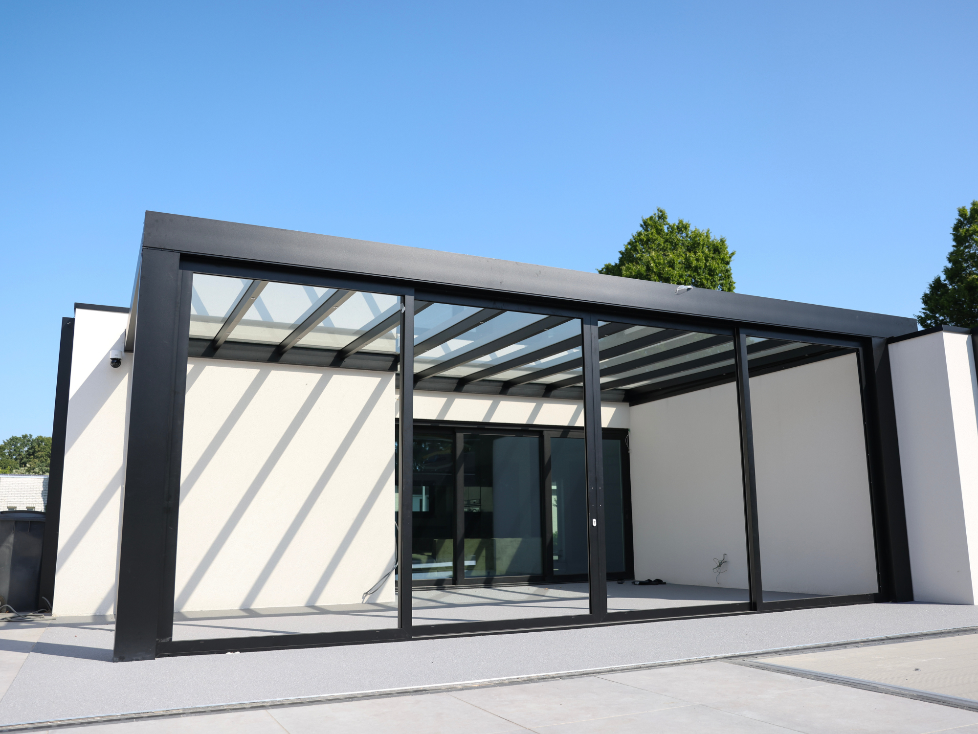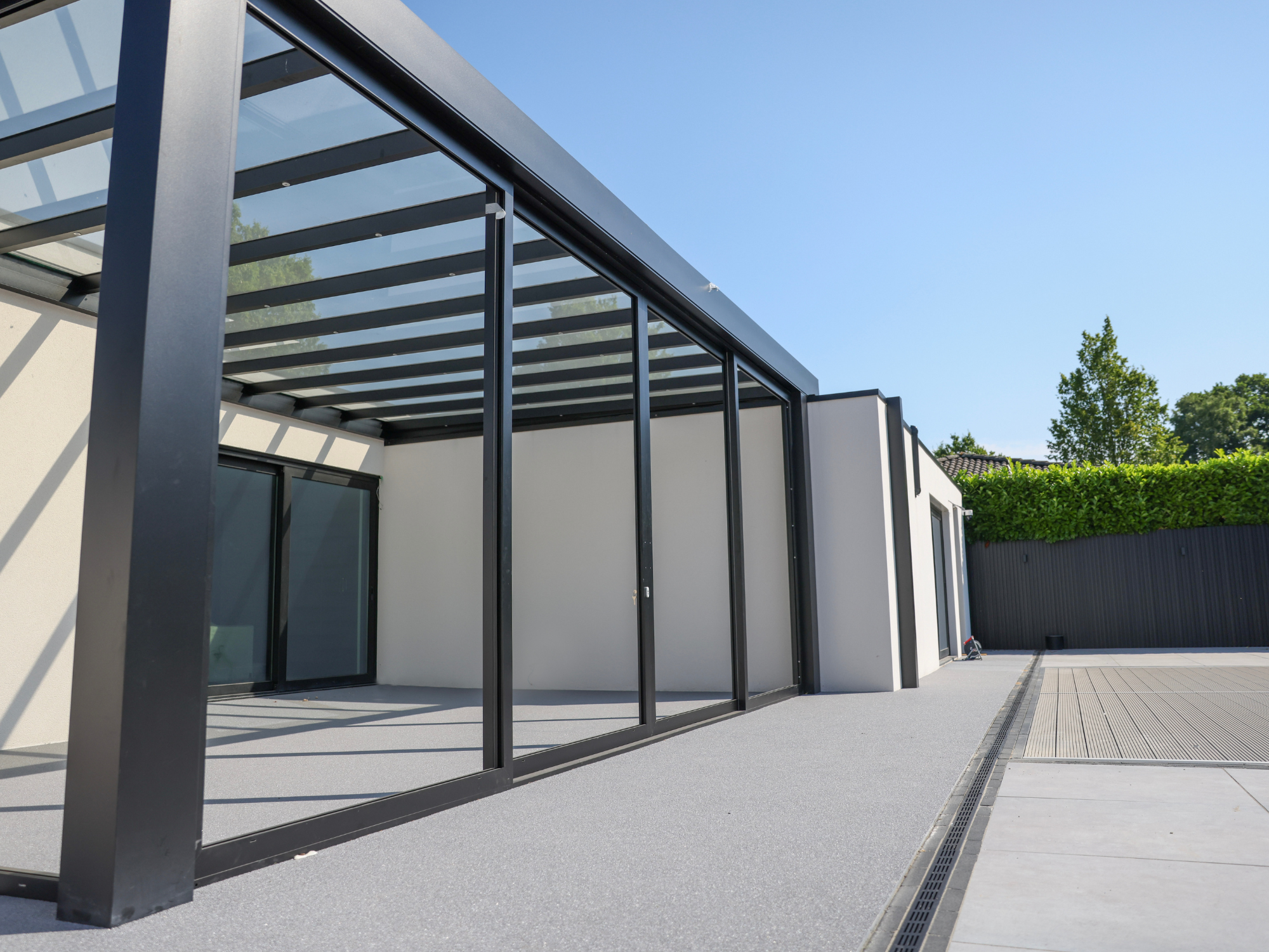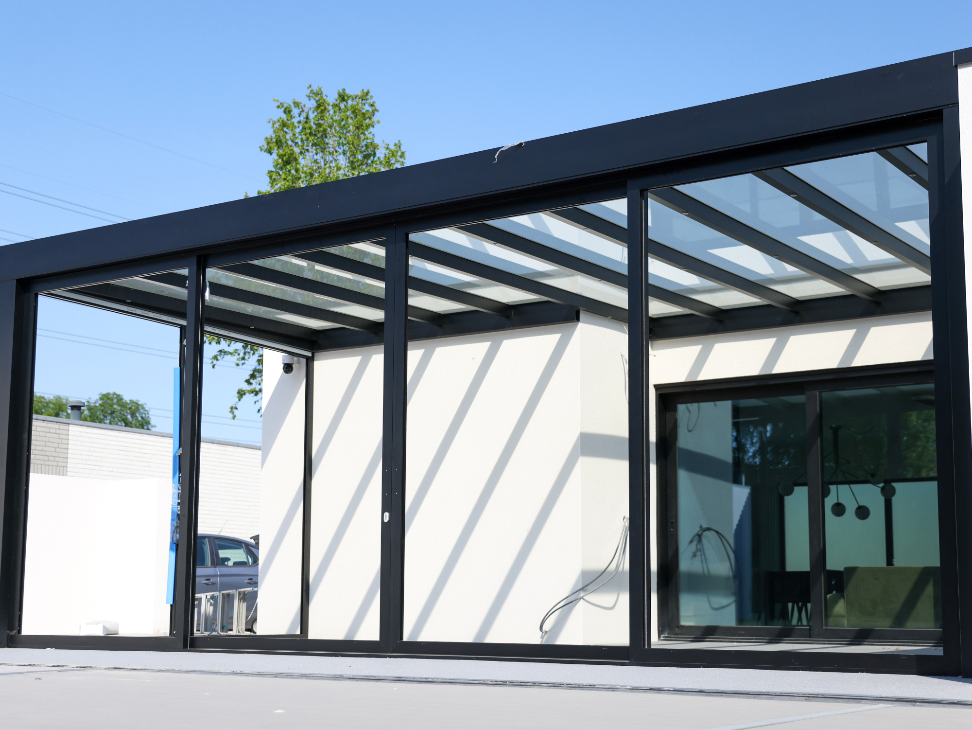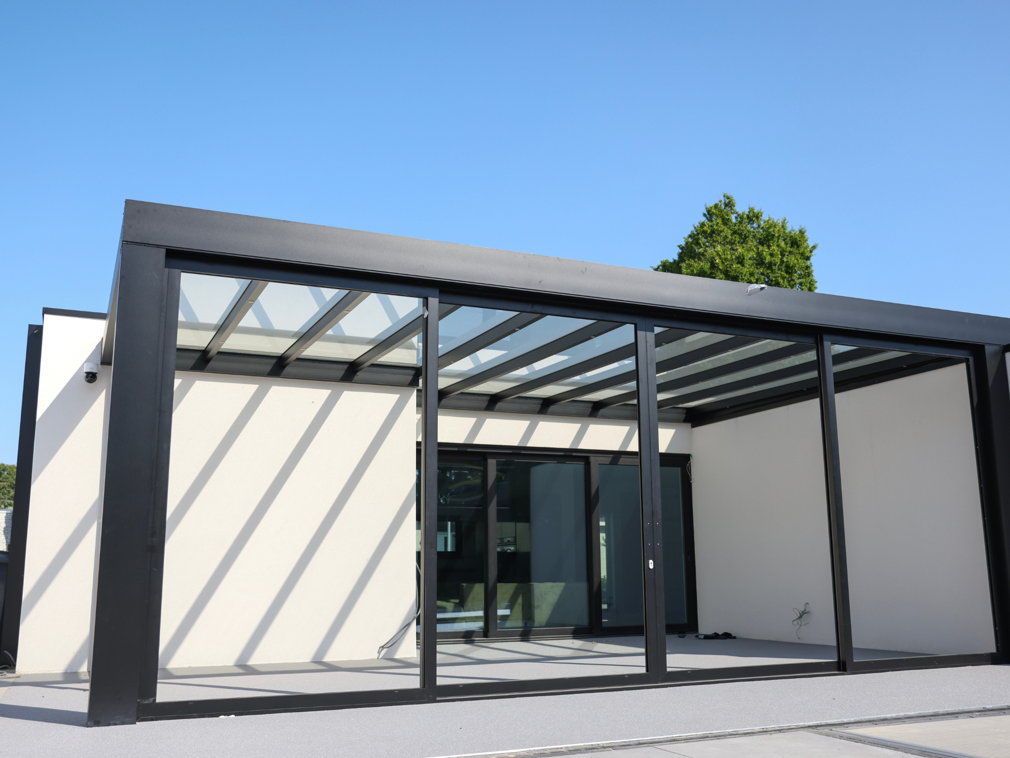 Prezentowany projekt to nowoczesne zadaszenie tarasu, które zostało wykonane z wysokiej jakości materiałów – czarnej, matowej konstrukcji aluminiowej oraz przejrzystych tafli szklanych. Dach wykonano z hartowanego szkła, które nie tylko nadaje lekkości całej konstrukcji, ale też zapewnia maksymalne doświetlenie przestrzeni tarasowej. Zadaszenie zamontowano bezpośrednio do ściany budynku, co zapewnia stabilność i estetyczne dopasowanie do bryły domu.